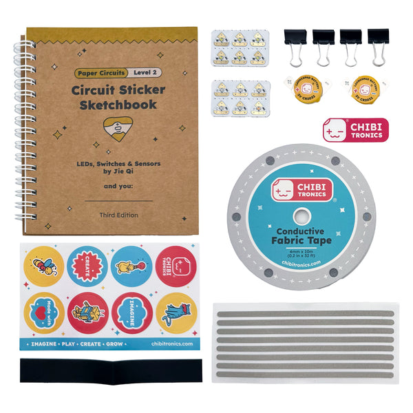 Our Create with STEAM: LED Circuit Sticker Kit includes the newest edition of our Circuit Sticker Sketchbook! This all-inclusive kit (recommended for ages 8+) offers a deeper dive into paper circuits, including instruction on the use of switches, sensors, and LED stickers.