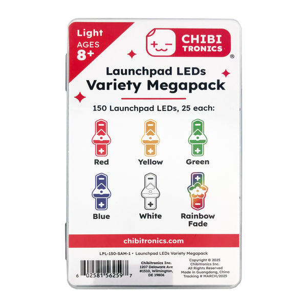 Launchpad reusable LEDs have large, sturdy pads that are clearly identified as positive and negative. This makes it easier for learners to make (and remake) circuits to light up a project. The Launchpad LEDs Variety MegaPack contains 150 LEDs (in 6 different colors).