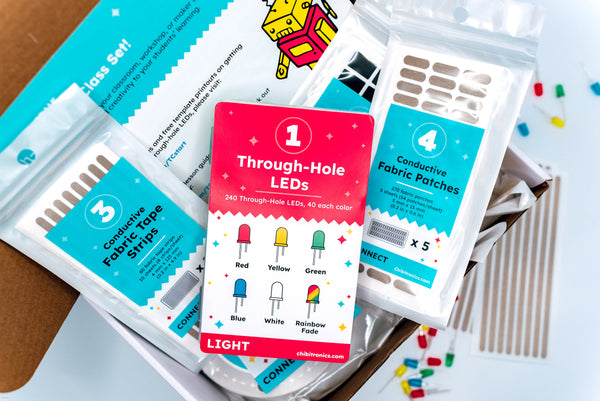 TEACH ADVANCED CIRCUITRY – The Chibitronics Through-Hole LED Class Set is designed for educators and makers who want to teach circuitry through hands-on paper crafting projects.